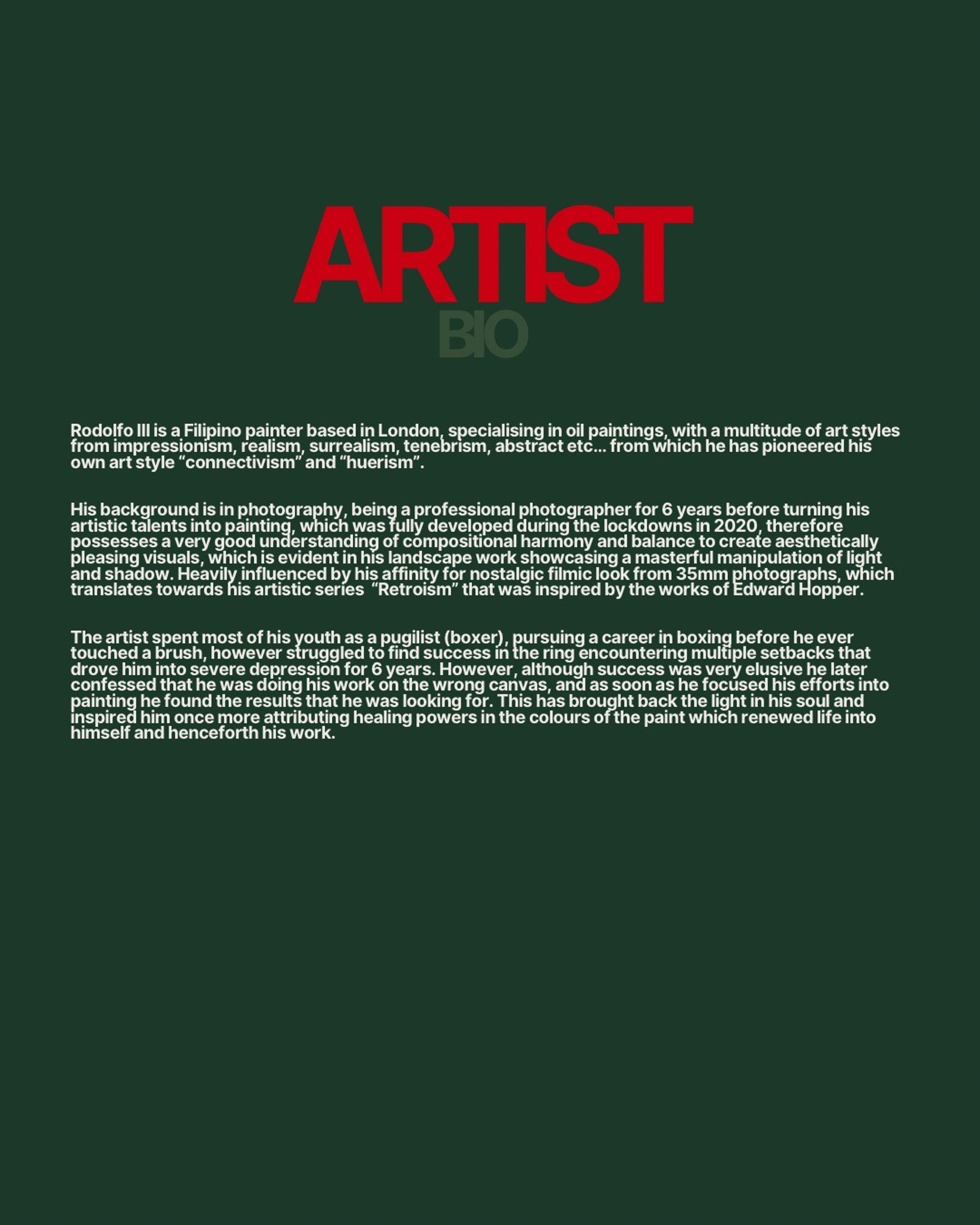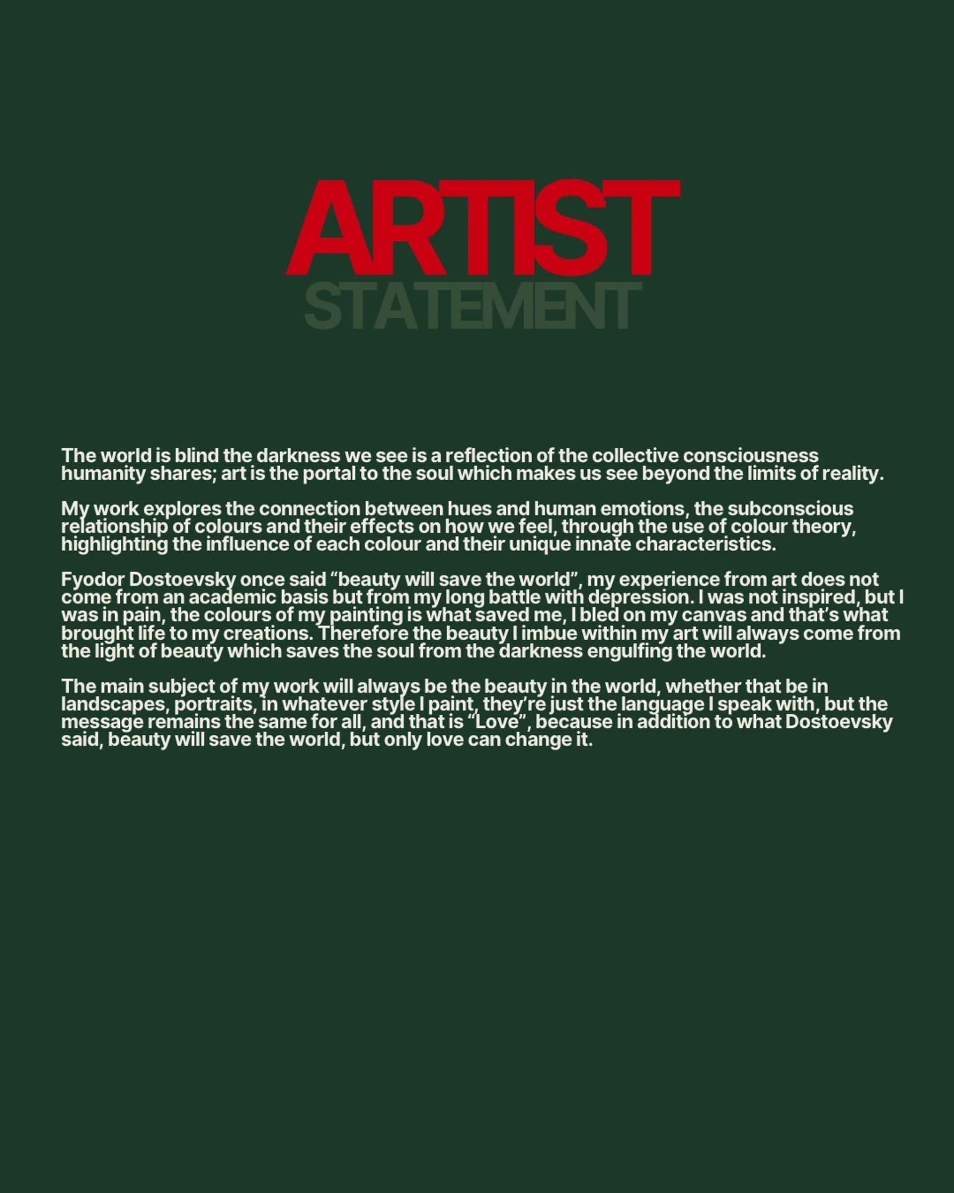 Avant-garde artist specialising in the use of colour theory, I’m an authentic colourist that delves into the connection of human emotion found in the value of hues. Inspired by artists like Picasso, Edward Hopper, Vincent Van Gogh, Tamara De Lempicka, my works portray the beauty that can only be touched by the vibrancy of colours, this is the protagonist to every story I paint and the driving narrative to my works.